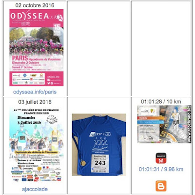 Ainsi que toutes les courses que j'ai déjà faites et celles où je suis inscrites, avec l'affiche de la course, le lien vers le site de la course, le t-shirt, la médaille et mon dossard, mon chrono officiel avec mon diplôme, le chrono et le lien vers le parcours que j'ai enregistré, et le lien vers la page de ce blog où je raconte ma course.
